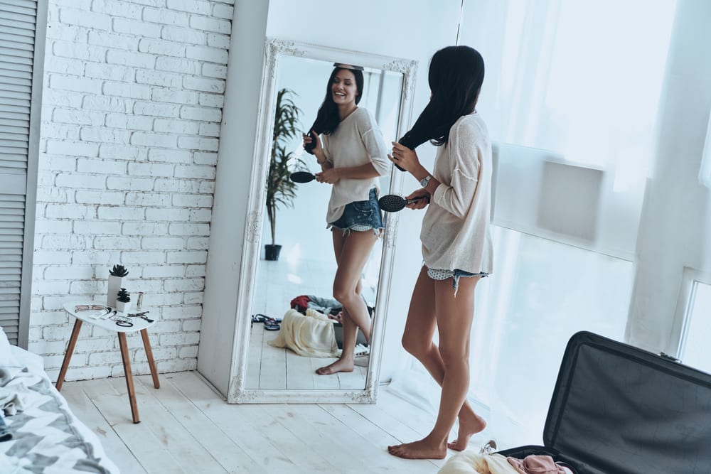 Girl looking in full-length mirror